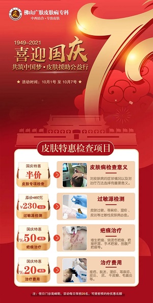 国庆节放假期间,佛山禅城江湾8:00开诊,专家门诊、普通门诊、专家会诊及各种辅助检查照常开展,并开展多项公益援助活动!假期间更好的